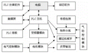 光機(jī)電一體化實(shí)訓(xùn)裝置由型材導(dǎo)軌式實(shí)訓(xùn)臺(tái),典型機(jī)電一體化設(shè)備機(jī)械部件,PLC模塊,變頻器模塊,按鈕模塊,電源模塊,低壓電器模塊,模擬生產(chǎn)設(shè)備實(shí)訓(xùn)模塊(包含上料機(jī)構(gòu),搬運(yùn)機(jī)械手,皮帶輸送線,物件分揀等)接線端子排,各種傳感器,警示燈和氣動(dòng)電磁閥等組成。整體結(jié)構(gòu)采用開(kāi)放式和拆裝式設(shè)計(jì),學(xué)生可以組裝,接線,編程和調(diào)試由上料機(jī)構(gòu),搬運(yùn)機(jī)械手機(jī)構(gòu),皮帶輸送線和物料分揀組成的光機(jī)電一體化設(shè)備。裝置的總體結(jié)構(gòu)示意圖如圖主所示。