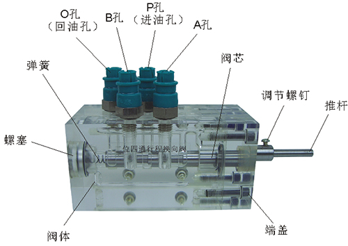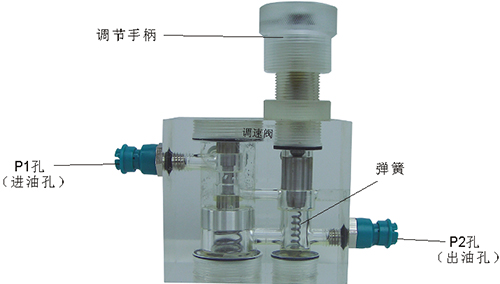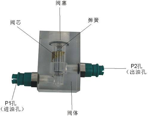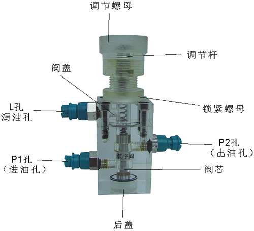 2、溢流閥結構上參考了國產P-63B型低壓直動式溢流閥,其閥體閥蓋、鎖緊螺母、調節(jié)螺母、螺塞等采用了進口透明有機玻璃材料精制而成,閥芯、調節(jié)桿采用了45#中碳鋼材料。并配合彈簧,油接頭,密封圈等標準件裝配而成,通過它可明確地觀察到閥芯、彈簧、油孔等結構及其運行過程,具有形象逼真,性能可靠等優(yōu)點。它即可作為教學模型,也可以作為液壓實驗元件進行實驗演示。
