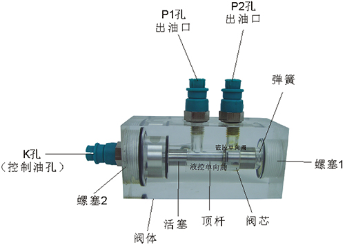 2、液控單向閥結構上參考了國產IY-25B型液壓單向閥,其閥體、螺塞等采用了進口透明有機玻璃材料精制而成,閥芯、頂桿采用了45#中碳鋼材料,并配合彈簧,油接頭,密封圈等標準件裝配而成,通過它可明確地觀察到活塞、彈簧、油孔等結構及其運行過程,具有形象逼真,性能可靠等優(yōu)點。它即可作為教學模型,也可以作為液壓實驗元件進行實驗演示。