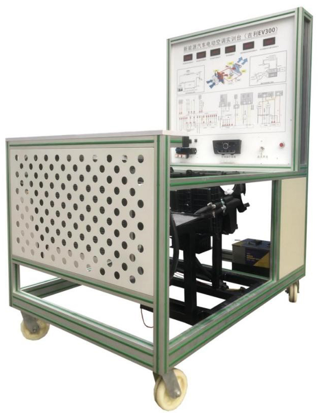點火開關(guān)、電動汽車空調(diào)壓縮機、膨脹閥總成、干燥器總成、鼓風機總成、冷凝器、冷卻電子風扇、電動空調(diào)壓縮機控制器總成、空調(diào)蒸發(fā)箱總成、充電器與充電接口、充電插線、DC-DC轉(zhuǎn)換器、鋰電池組、空調(diào)操作面板、高低壓空調(diào)壓力表、采暖模塊總成、電源總開關(guān)、急停開關(guān)、直流接觸器、輔助蓄電池(12V45AH)、一體化全鋁合金型材搭建的移動臺架(1500×1000×1700mm ,帶自鎖腳輪裝置,帶安裝檢測端子的原理面板948×898mm)、故障模擬與排除裝置、設備操作說明書。