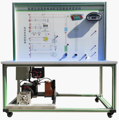 檢測(cè)控制面板(裝有各種檢測(cè)端子,1448×940mm彩色電路圖和工作原理示意圖)、組合儀表、點(diǎn)火開(kāi)關(guān)、電機(jī)控制器、車(chē)載充電器與充電接口、DC-DC轉(zhuǎn)換器、鋰動(dòng)力電池組、電動(dòng)車(chē)電機(jī)(交流異步電動(dòng)機(jī))、剎車(chē)開(kāi)關(guān)、檔位開(kāi)關(guān)、油門(mén)控制裝置、大電流繼電器、電源總開(kāi)關(guān)、急停開(kāi)關(guān)、輔助蓄電池(12V45AH)、一體化全鋁合金型材搭建的移動(dòng)臺(tái)架(1500×700×1700mm (帶自鎖腳輪裝置,帶安裝檢測(cè)端子的原理面板,面板1448×940mm)、設(shè)備操作說(shuō)明書(shū)。