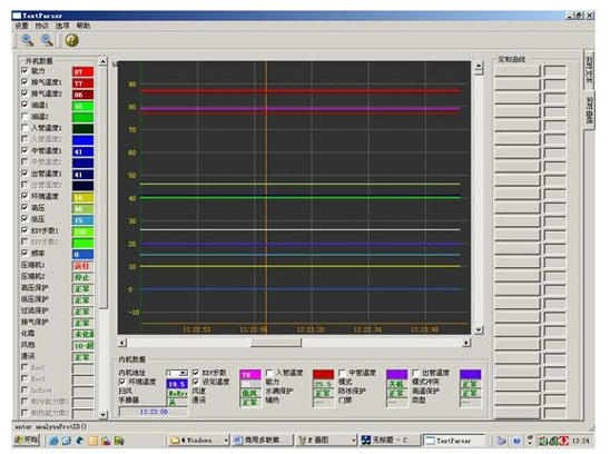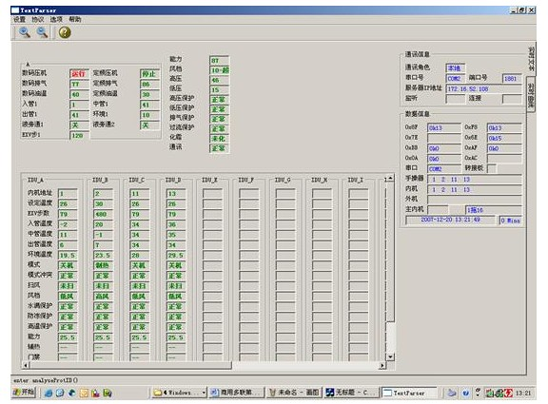 中央空調(diào)機(jī)由于工程復(fù)雜,設(shè)備分散,有的已經(jīng)裝修在開花板上測(cè)試程序,一但出現(xiàn)了故障,工程量相當(dāng)大,為了能夠快速準(zhǔn)確地測(cè)出故障是由主機(jī)機(jī)組還是室內(nèi)機(jī)的故障的,每個(gè)生產(chǎn)廠家根據(jù)生產(chǎn)的和維修的需要而開發(fā)了中央空調(diào)測(cè)試程序。可測(cè)試壓縮機(jī)的運(yùn)轉(zhuǎn)頻率,傳感器的各種數(shù)據(jù),電子膨脹閥的工作步數(shù)等幾十種中央空調(diào)的工作數(shù)據(jù)和狀態(tài),軟件可實(shí)現(xiàn)對(duì)內(nèi)機(jī)的控制,,可以對(duì)1-64臺(tái)內(nèi)機(jī)的狀態(tài)進(jìn)行設(shè)定。是高校提供了好的研究的學(xué)習(xí)設(shè)備。