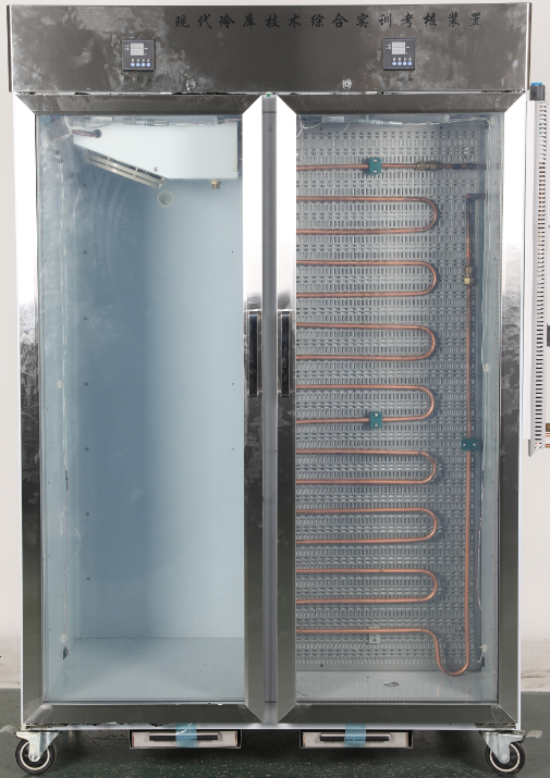 采用優(yōu)質(zhì)不銹鋼板做骨架,經(jīng)過(guò)機(jī)械加工成型,隔層采用聚氨酯發(fā)泡料保溫。設(shè)有左右兩個(gè)庫(kù)體,左邊為冷凍間,其頂部預(yù)先安裝有冷風(fēng)機(jī);右邊為冷藏間,安裝競(jìng)賽時(shí)可自制的光管式蒸發(fā)器。左右?guī)扉T中間部分采用三層發(fā)熱透明玻璃構(gòu)建,既符合保溫性能要求,又直觀大方。庫(kù)體的底部采用帶剎車的萬(wàn)向輪,方便調(diào)整設(shè)備的擺放位置。
