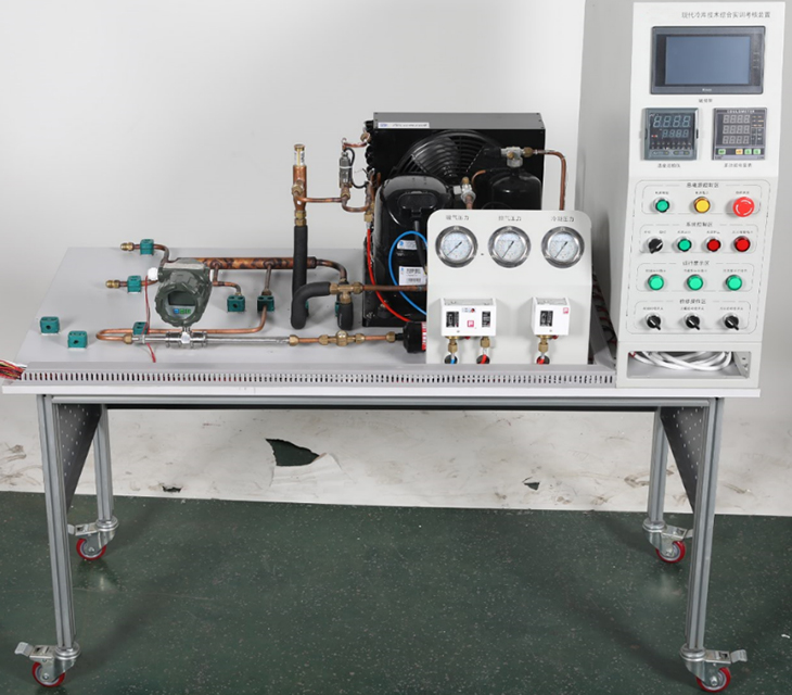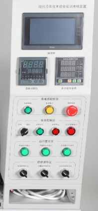 3、開放性。該設(shè)備設(shè)置了一個(gè)系統(tǒng)操作臺(tái),在庫(kù)體一側(cè)安裝有可更換側(cè)板,以便于學(xué)員在上述的操作臺(tái)與側(cè)板上安裝制冷系統(tǒng)和電路系統(tǒng)等。