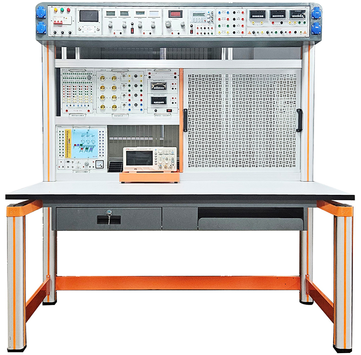 實驗桌后面二支桌腳向上延伸,配上特制拉模成型的帶滑槽橫梁鋁型材組成實訓(xùn)屏,實訓(xùn)時左邊放置電氣實訓(xùn)掛箱(2層)及示波器支架,右邊裝置網(wǎng)孔板等,實訓(xùn)掛箱、網(wǎng)孔板在實訓(xùn)屏上實訓(xùn)時上下方便,左右移位自如。實訓(xùn)屏頂部安裝主機(jī)箱,實訓(xùn)屏底部安裝實驗儀器工作電源箱。