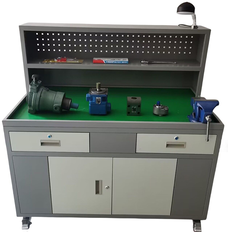 6、實訓臺:采用鈑金結構設計,表面為雙層亞光密紋噴塑工藝處理,臺面采用下凹設計,增加臺虎鉗,以及絕緣防滑墊,同時為液壓閥拆裝時提供一個良好的接油、防震平臺。